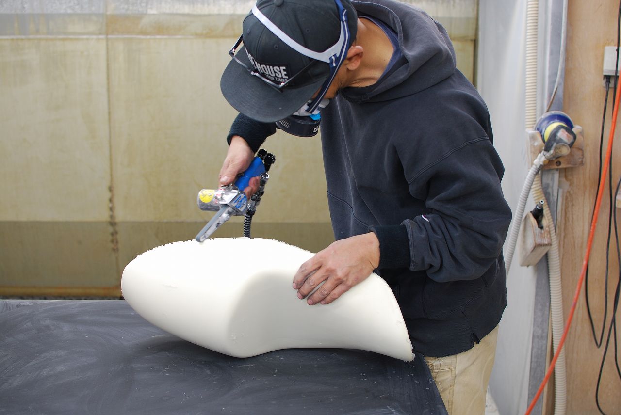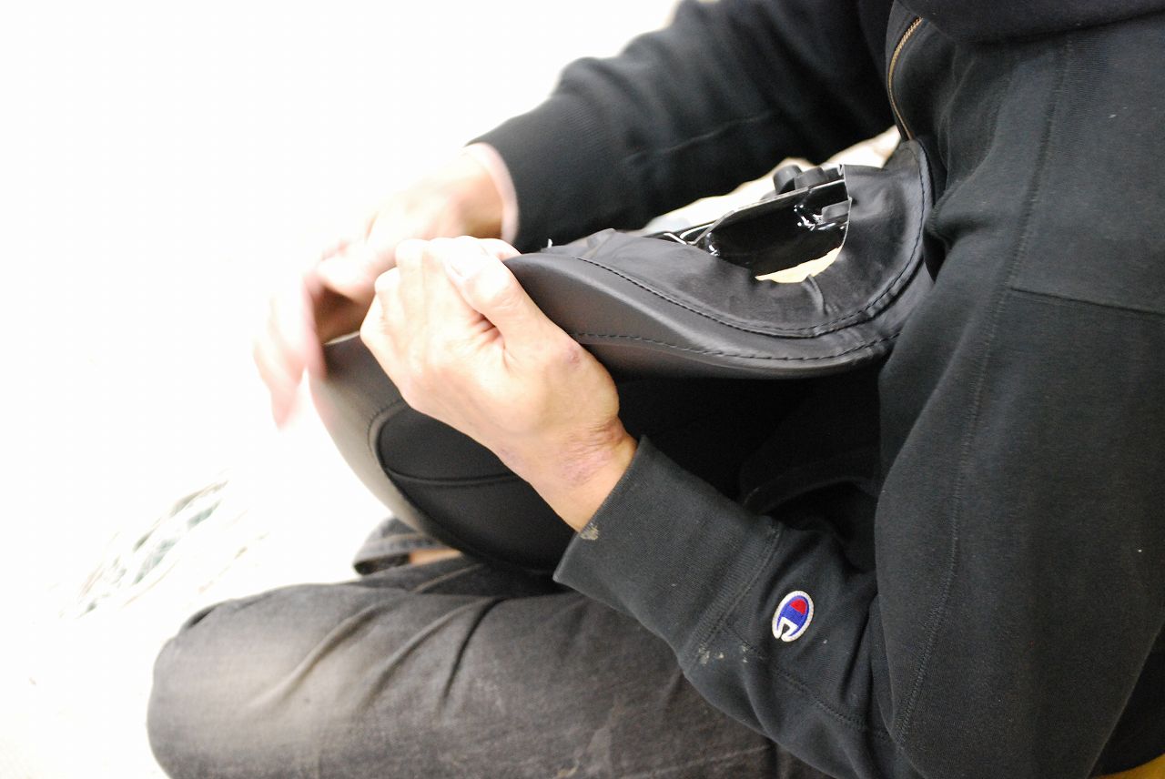 原型で型紙起こしたので、レザーを予め用意しておきまして、オオソネが即仮張り。