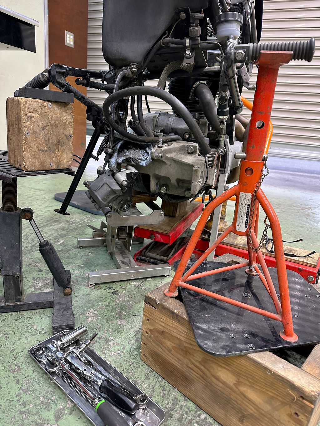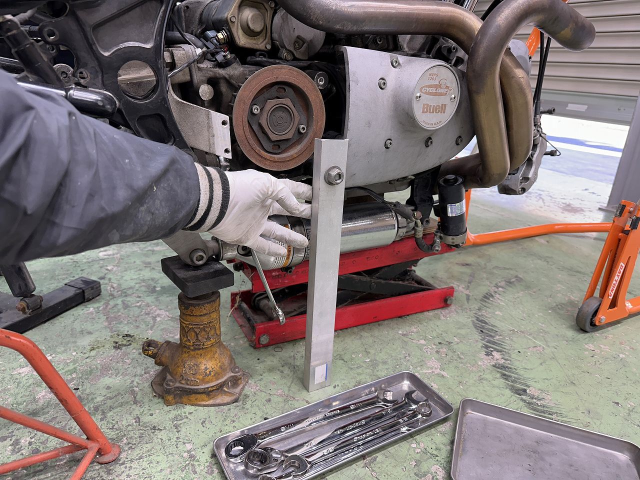 ケース(エンジン)にジャッキ掛けてフレームを情報へ抜くって感じかな。