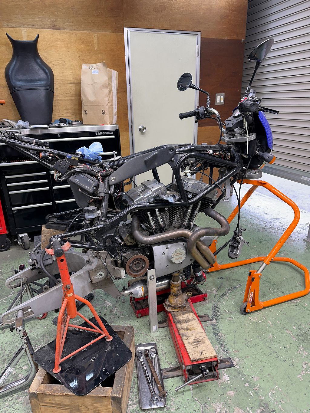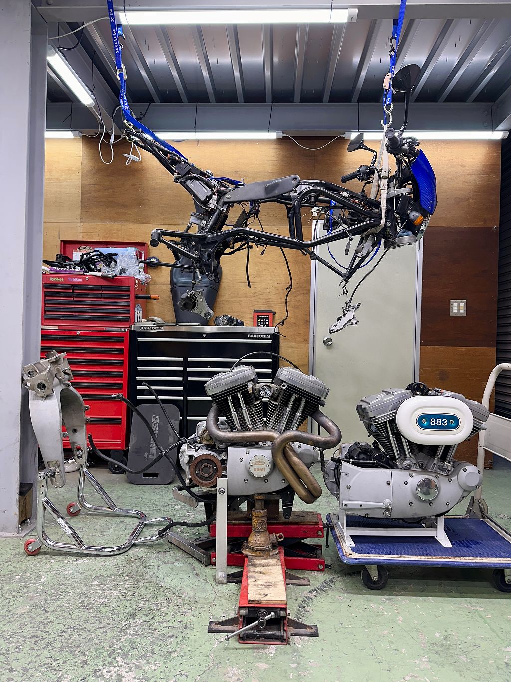 で、フレーム完吊りして 883の予備エンジン をおもむろに店から出してみる。