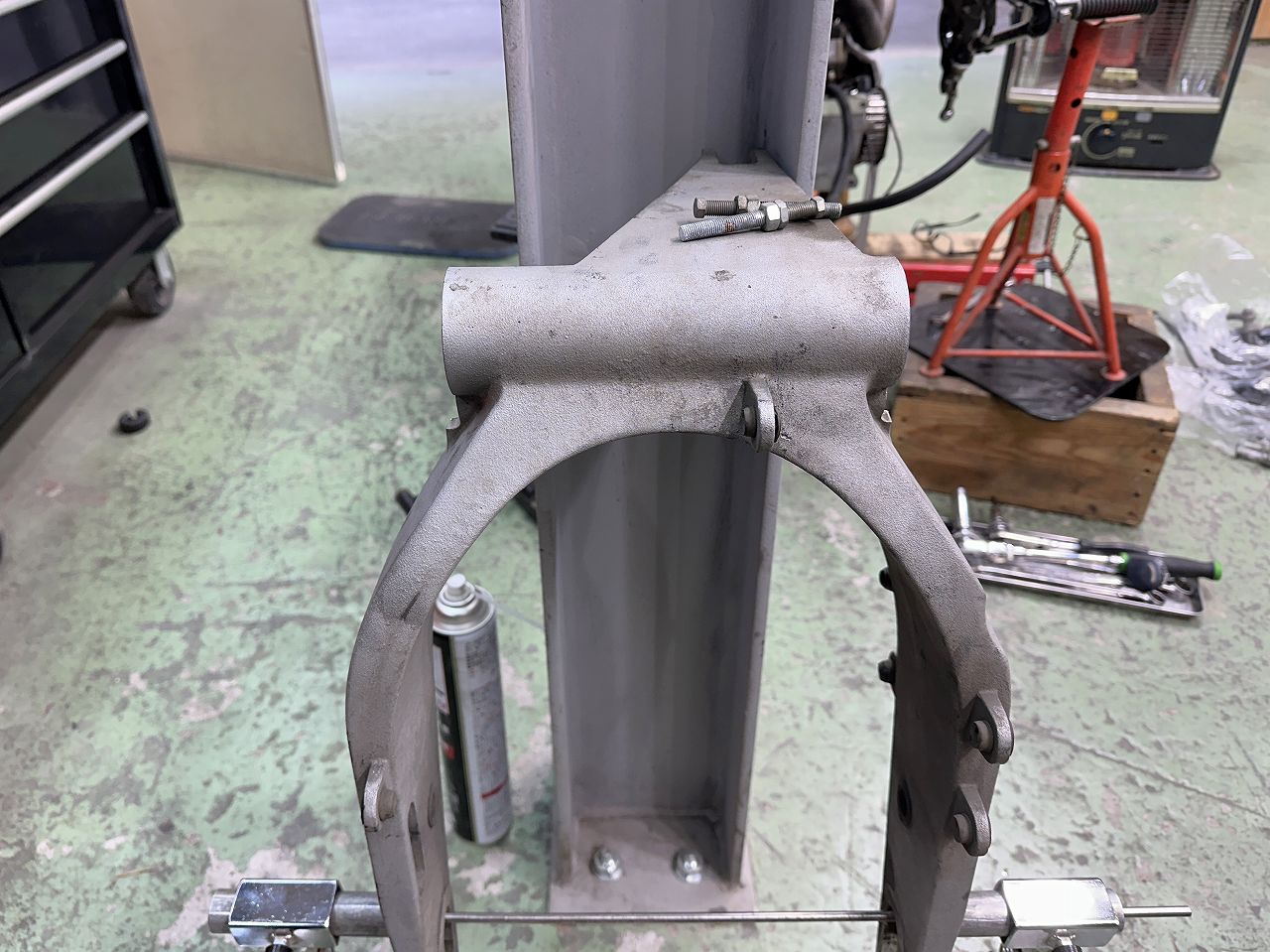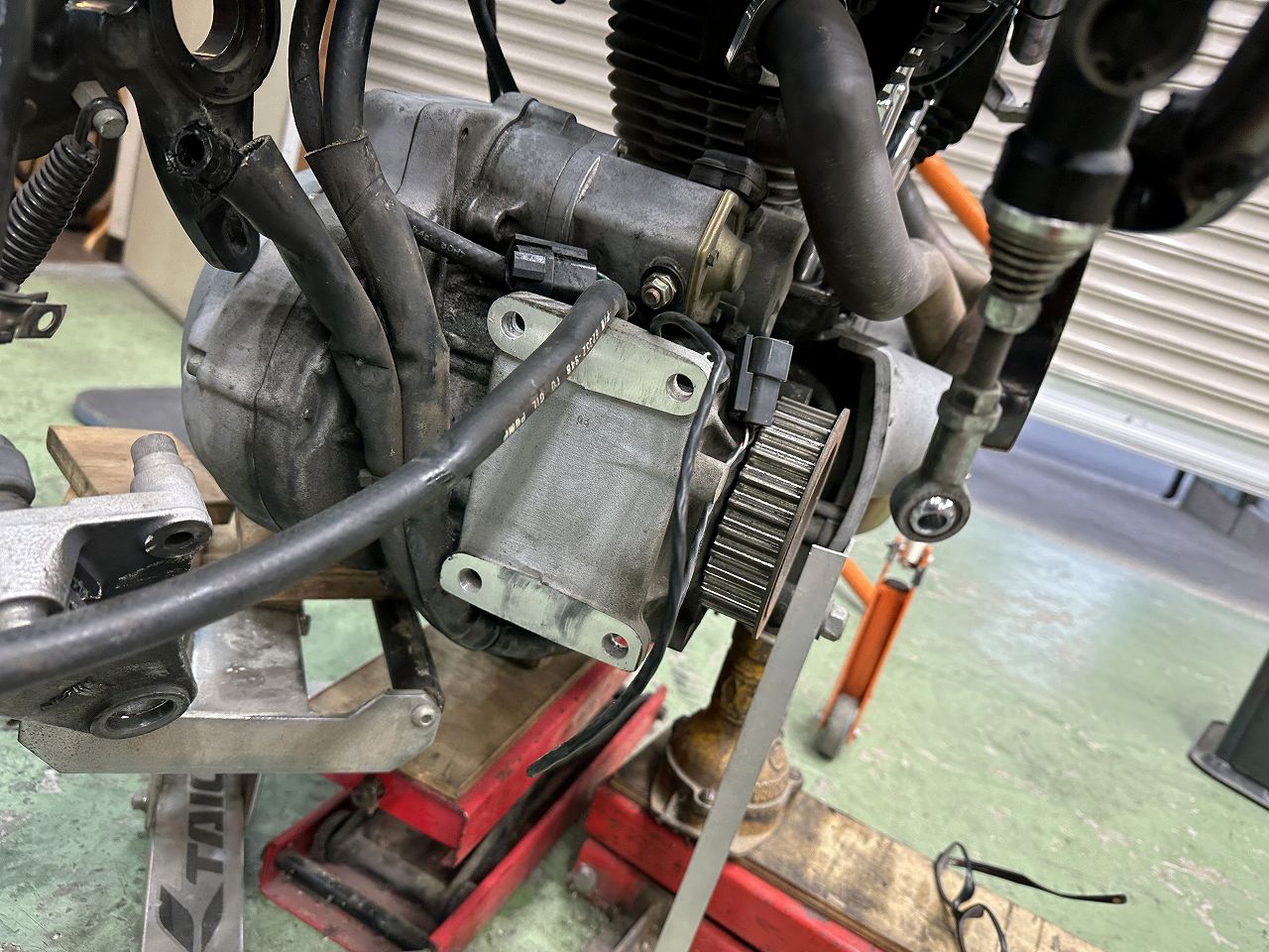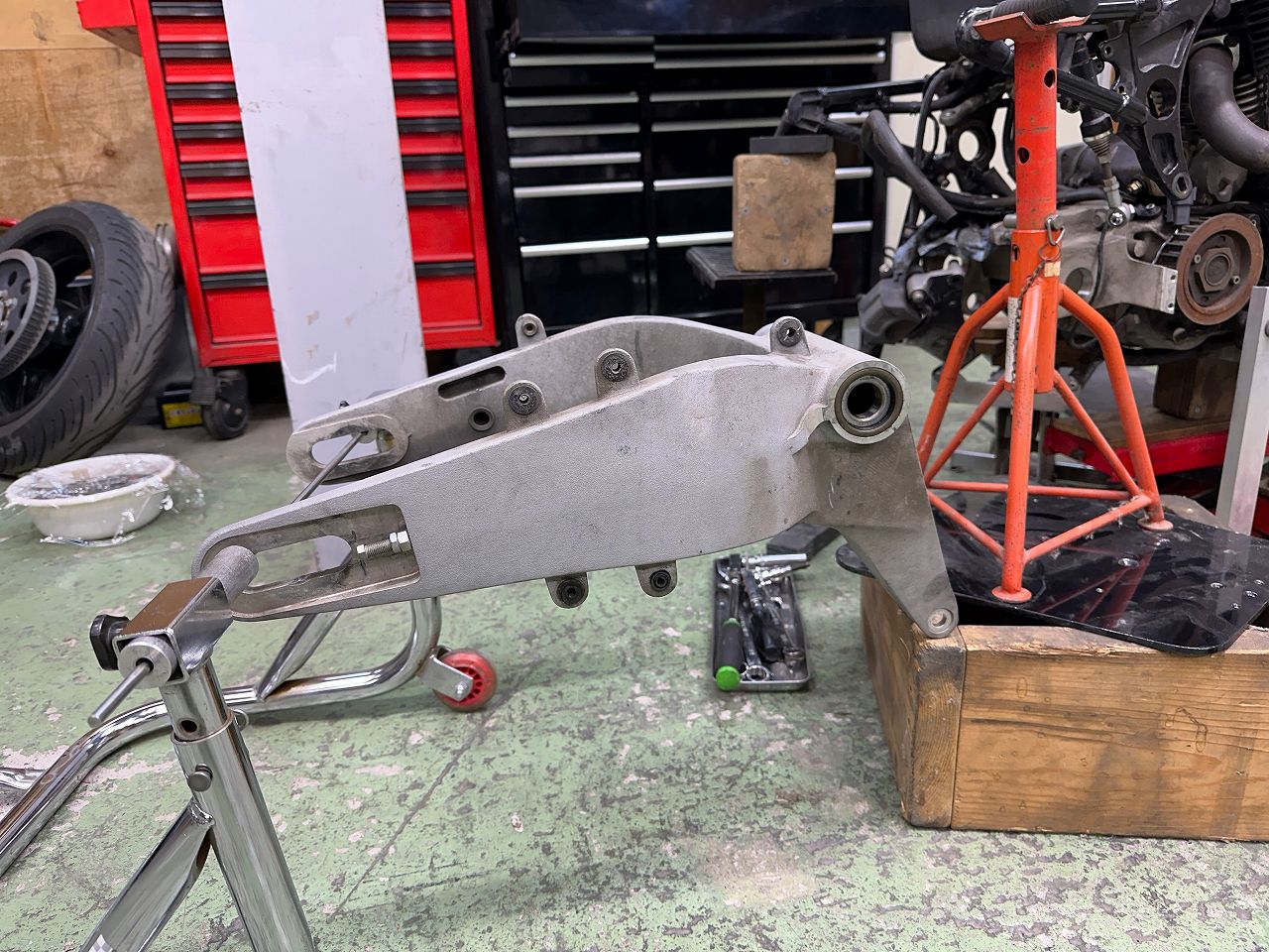 スイングアームを抜くにはスイングアームを固定しているスイングアームブロックを外さないといけないのだけど、そのブロックはフレームじゃなくてクランクケース(エンジン)に固定されているという芋づるシステム…。