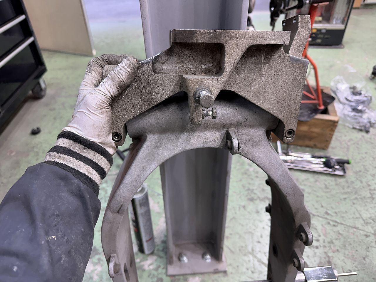 ここで初めてSAB(スイングアームブロック)とフレームの間に挟まっているアイソレーター(ゴム)が外れる。
