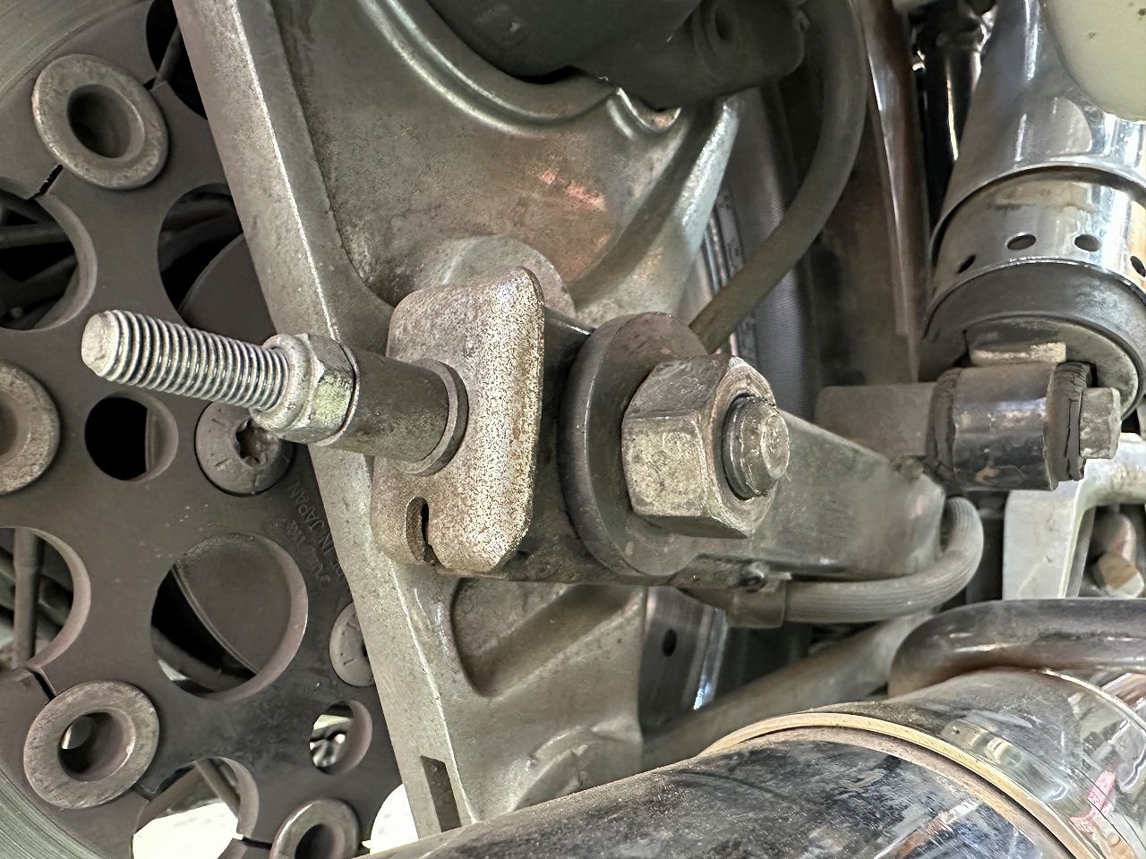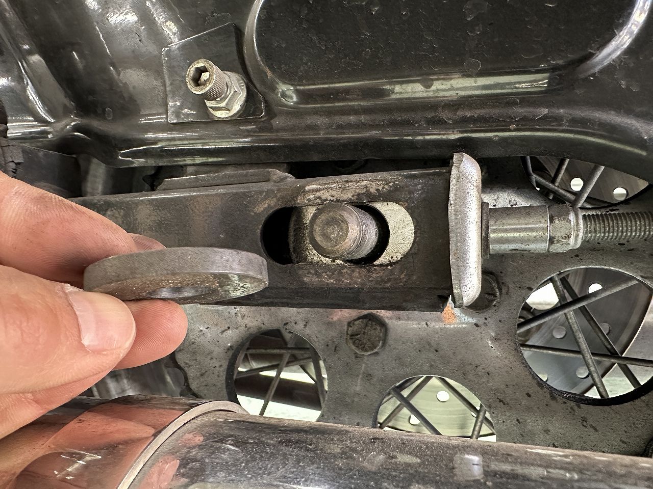 この頃のスイングアームは角パイプなのだけど、アクスル締結すると漏れなく座屈する。