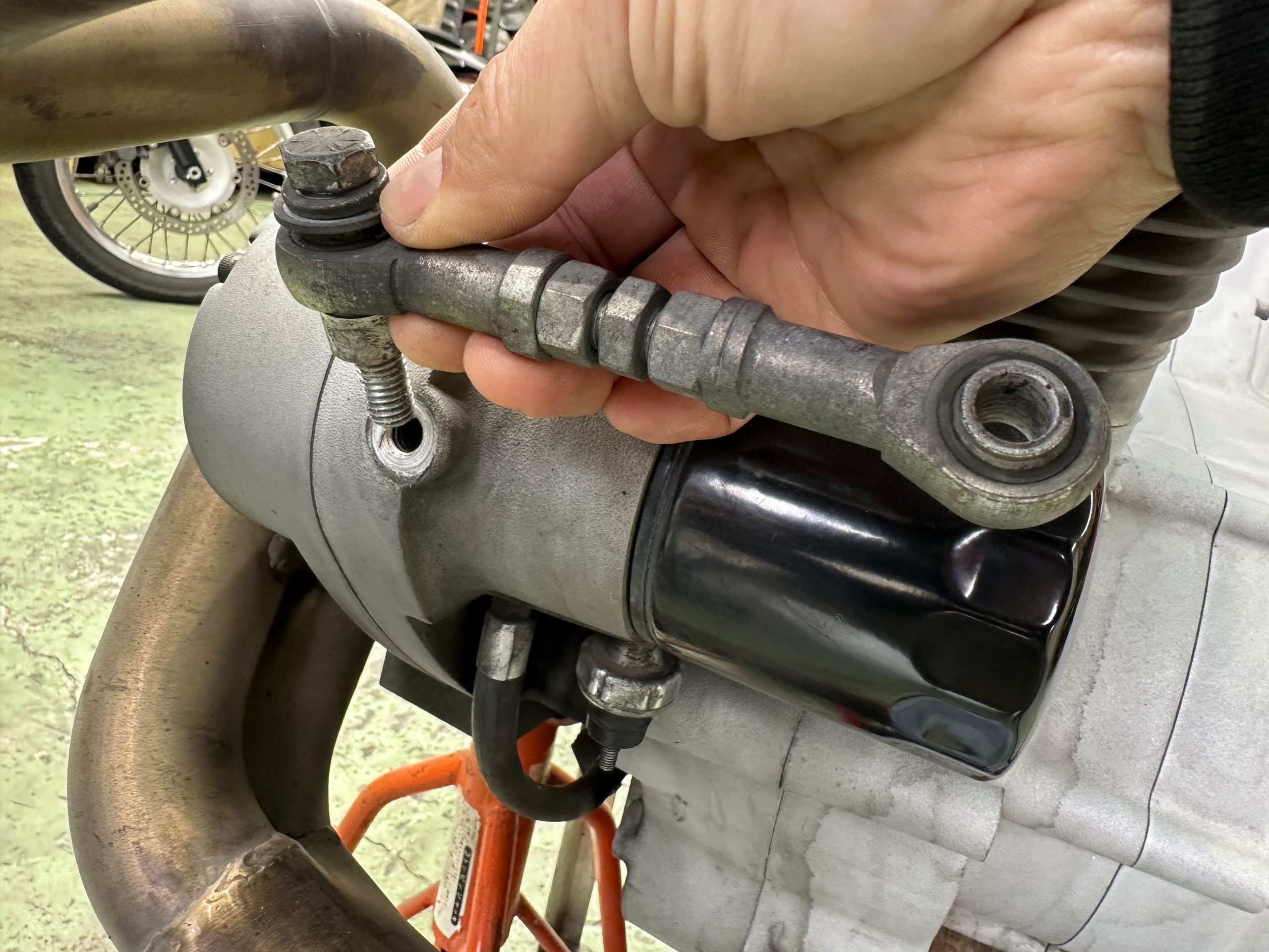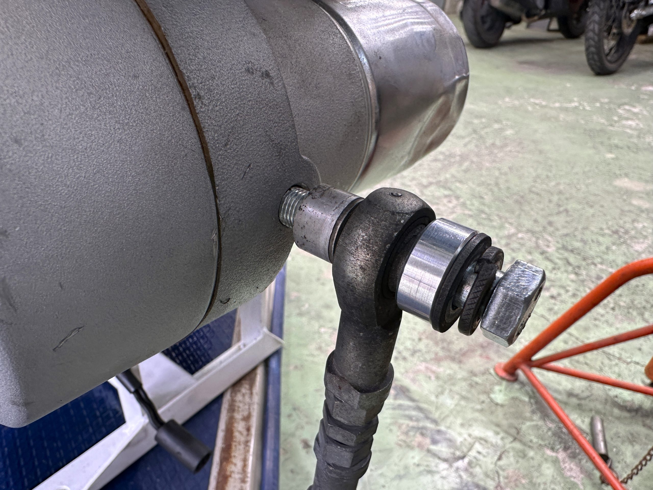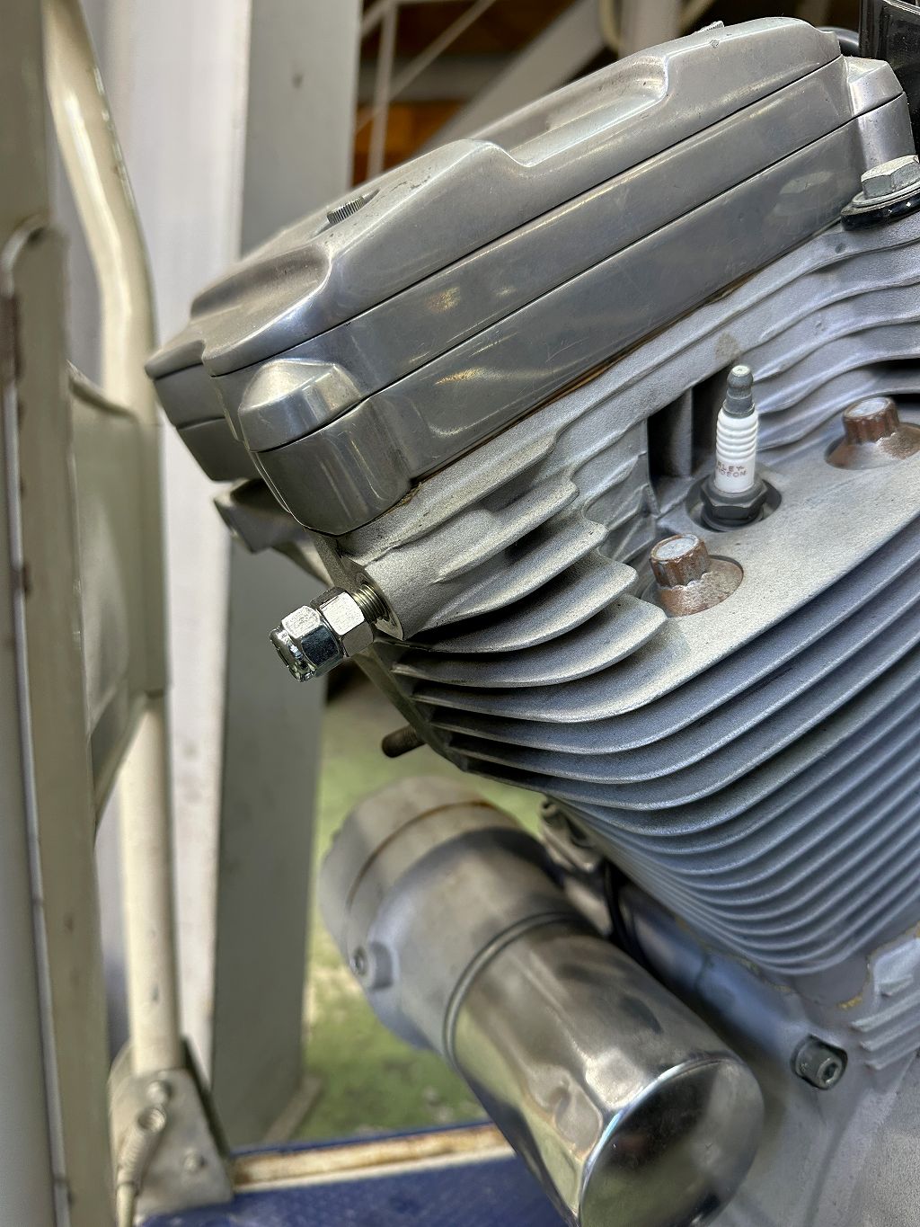 外すためにダブルナット掛けてあるけど、スポーツスターの前上方の左側マウントは、スタッドが立っている。