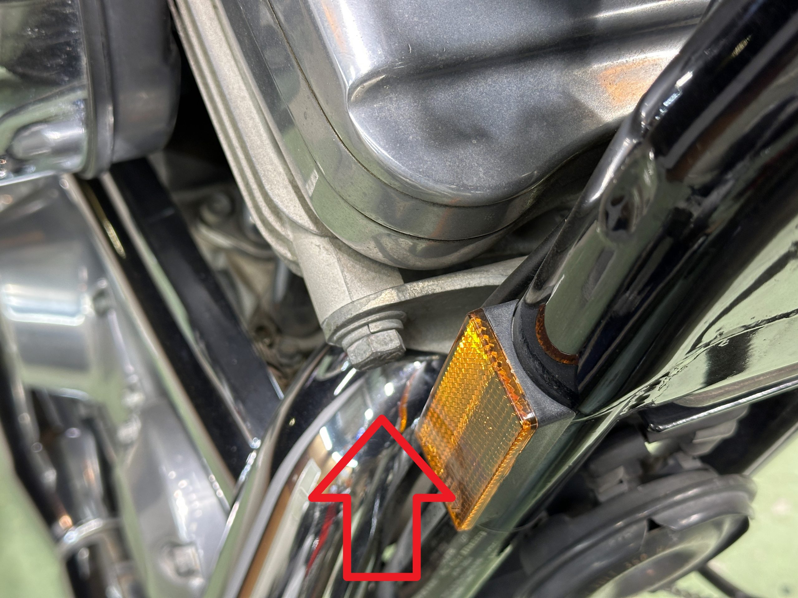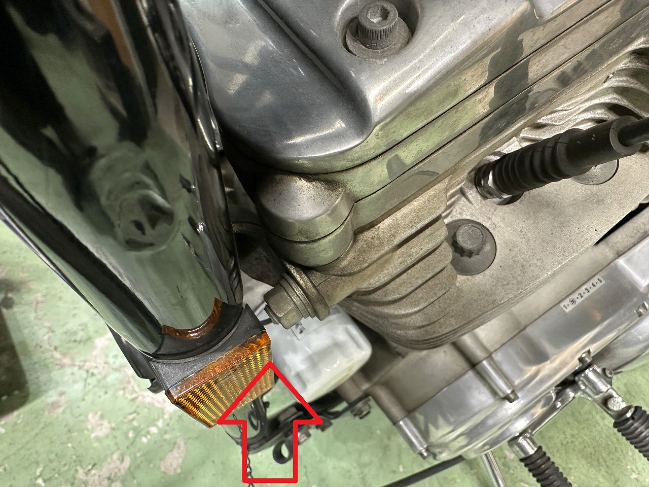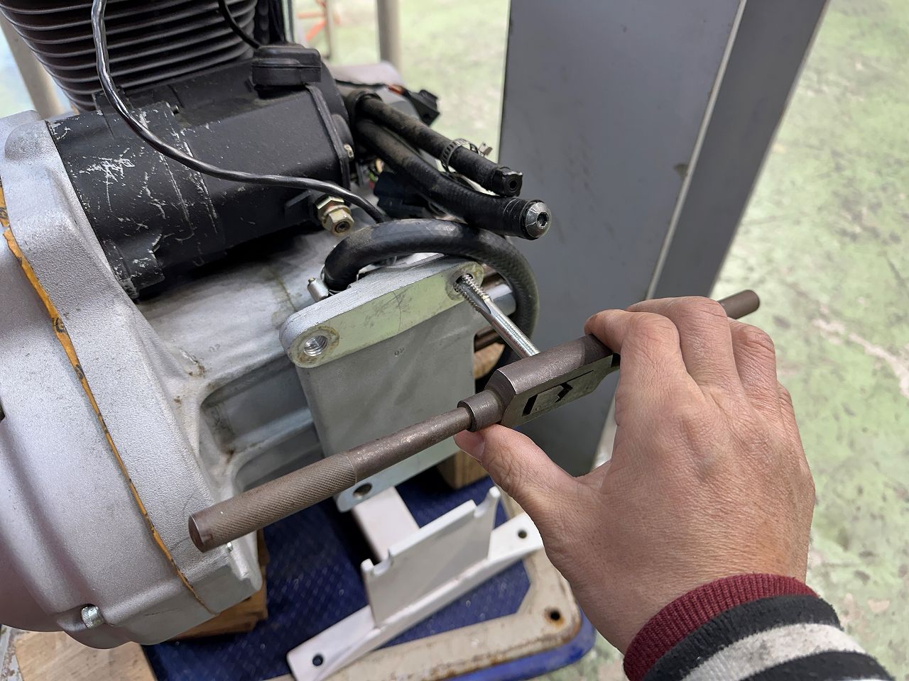 外すためにダブルナット掛けてあるけど、スポーツスターの前上方の左側マウントは、スタッドが立っている。