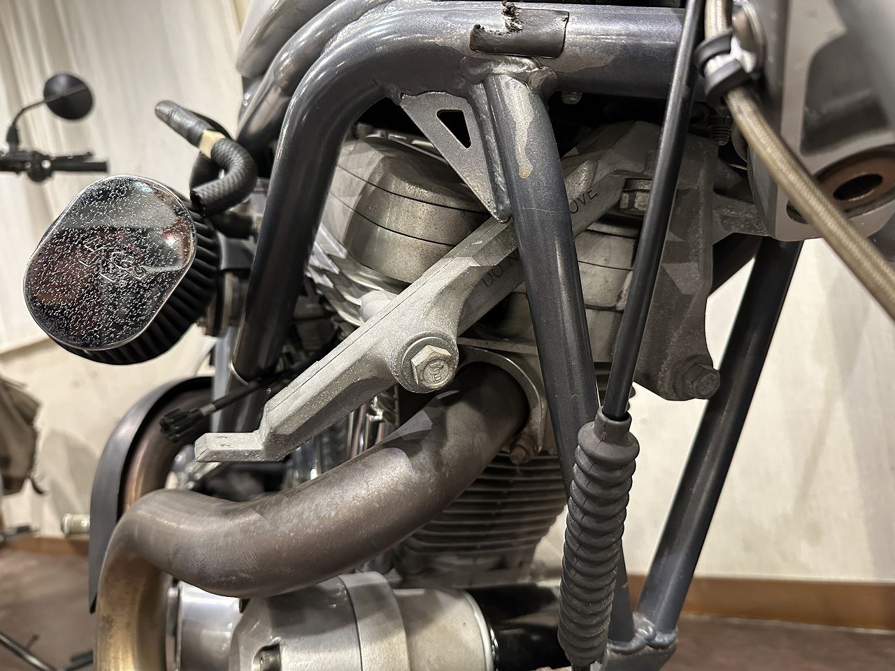 ヘッドのフロントバンク、両バンク間、後ろ側を3点リジッドフレームマウントするスポーツスター。
