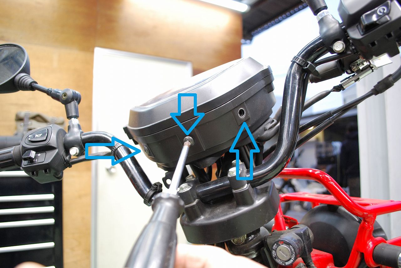 メーター本体を浮かせながら、メーターロアーケースを固定している3本のボルトを外します。