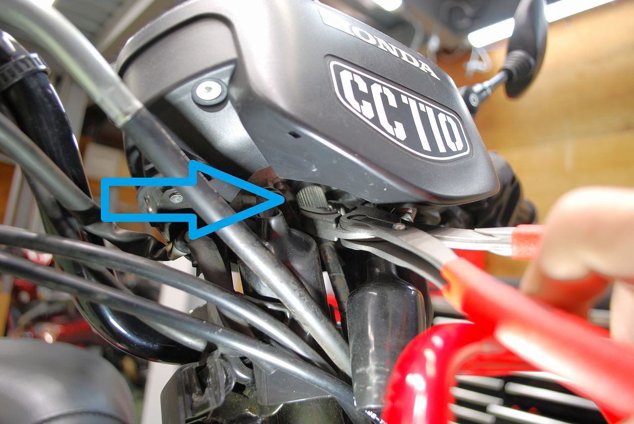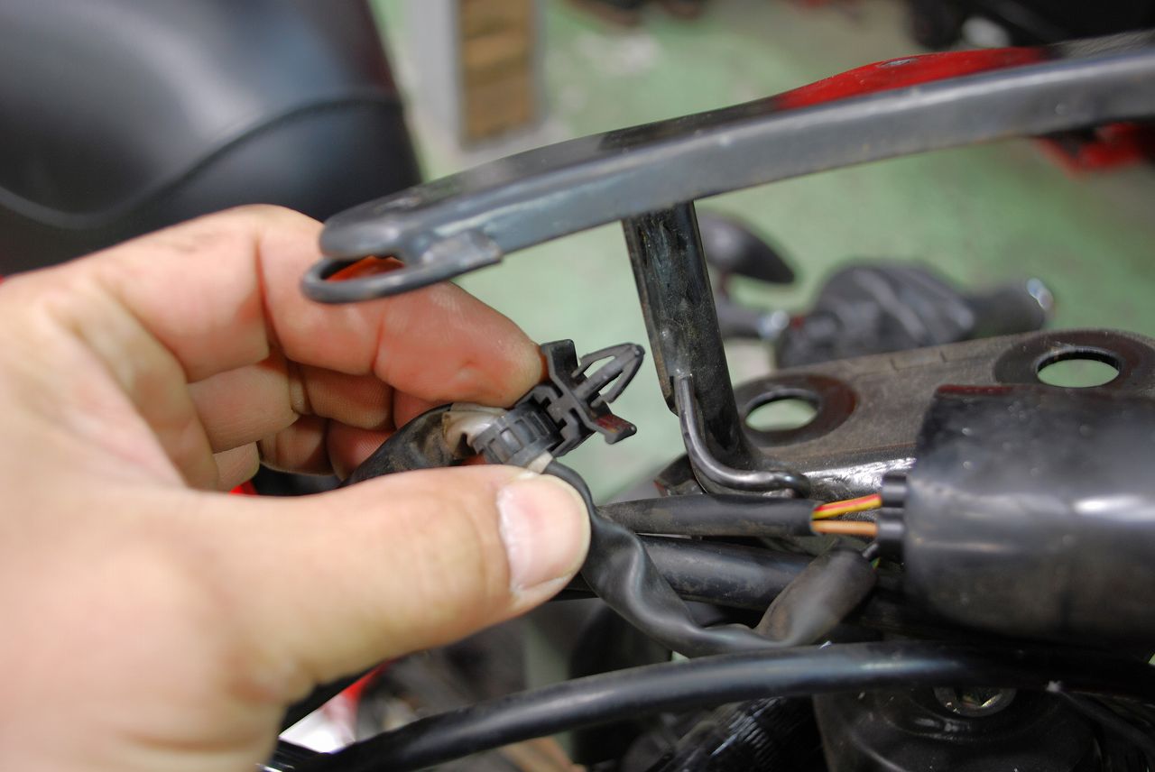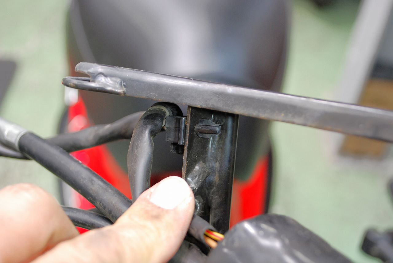 ハンドルポストのケーブルホルダー切り欠きからホルダー内側へ、ハーネスやスロットルケーブル、ブレーキホースを移動させ、純正オリジナルの取り回しに近くなるよう整理します。
