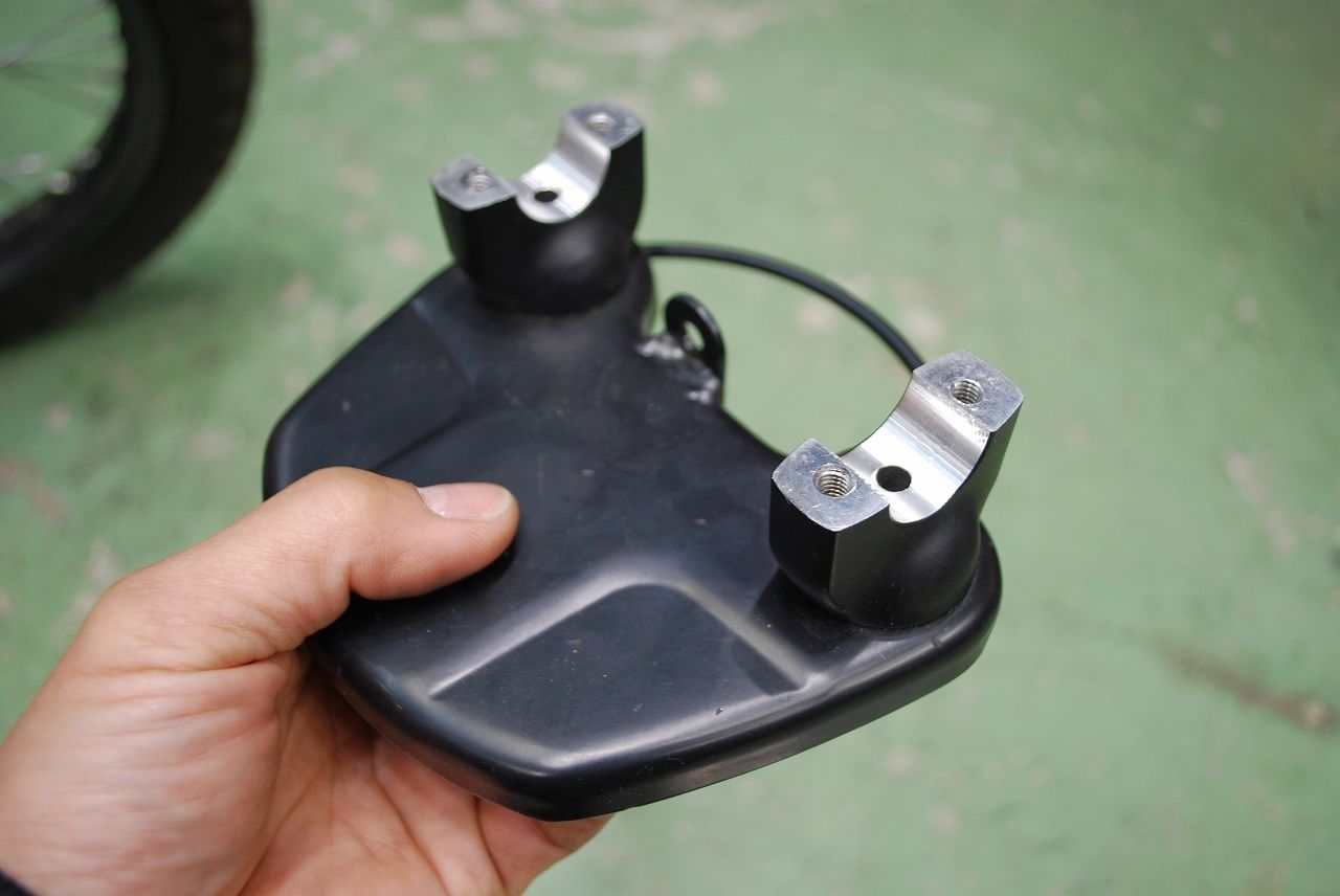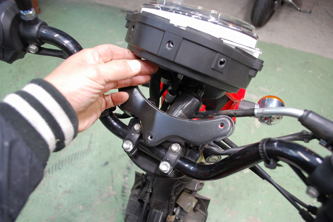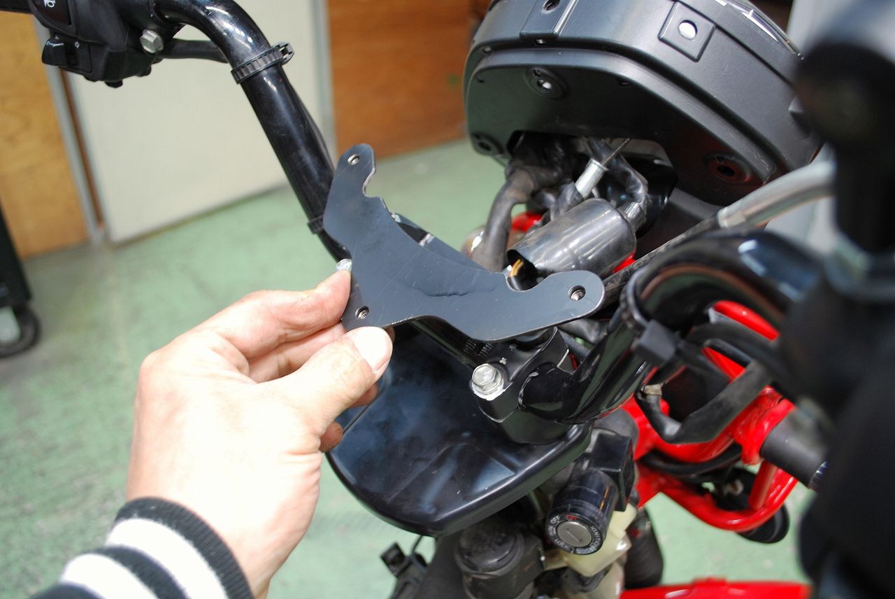 メーターステーを、付属の固定ボルト2本を用いてハンドルホルダー アッパー前側に合わせ仮組みします。