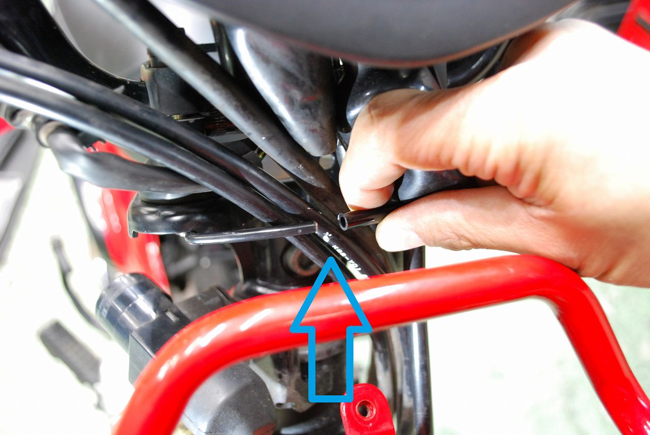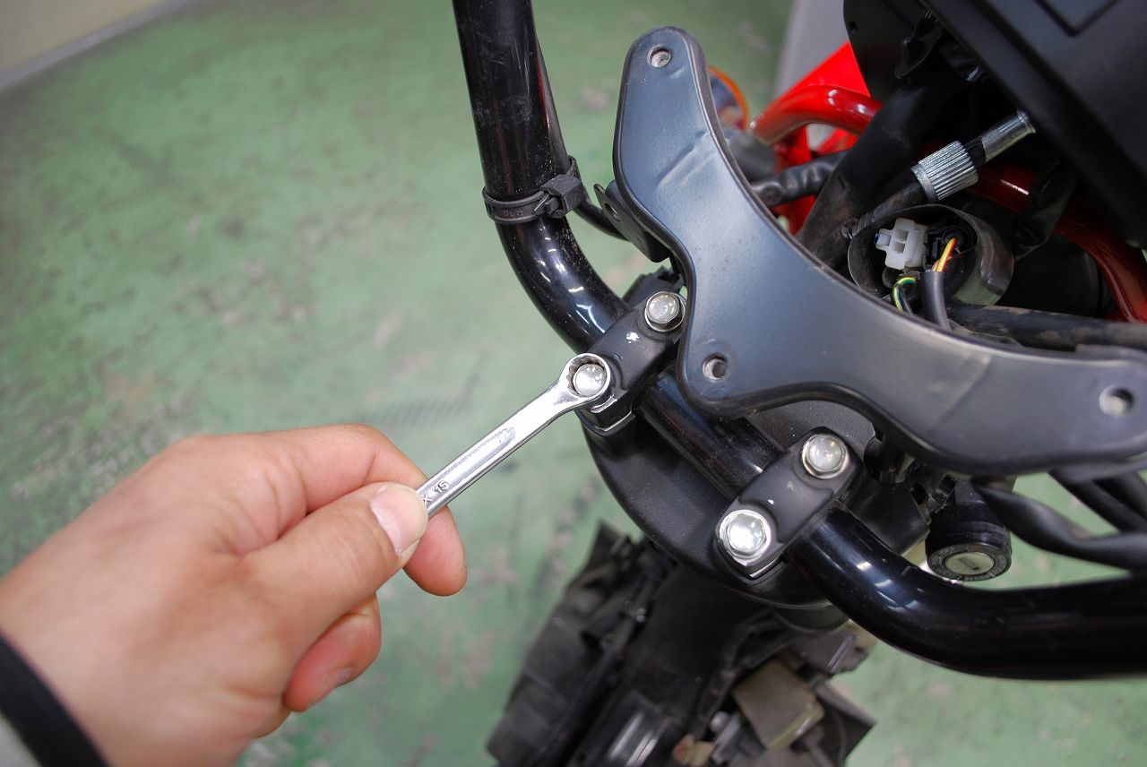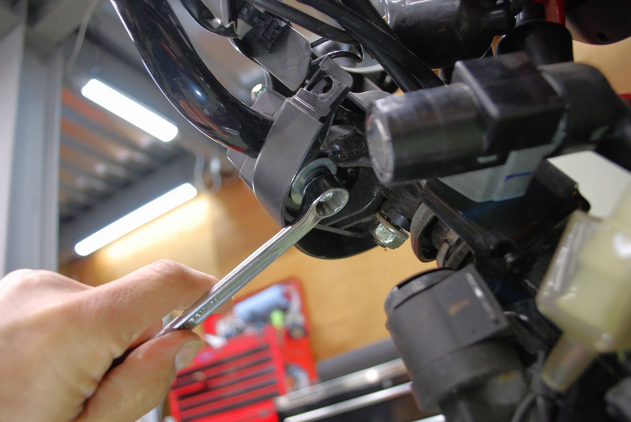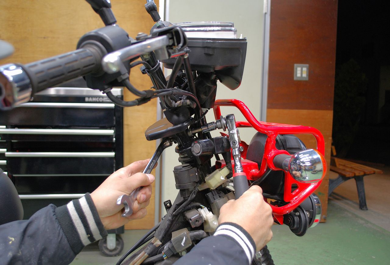 ハンドルを左右末切りし、ハーネスやブレーキホース、スロットルケーブルが車体に引っ掛からないか突っ張り過ぎていないか確認します。