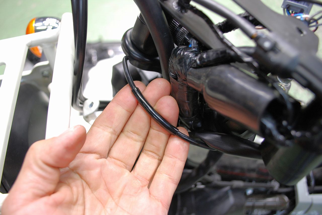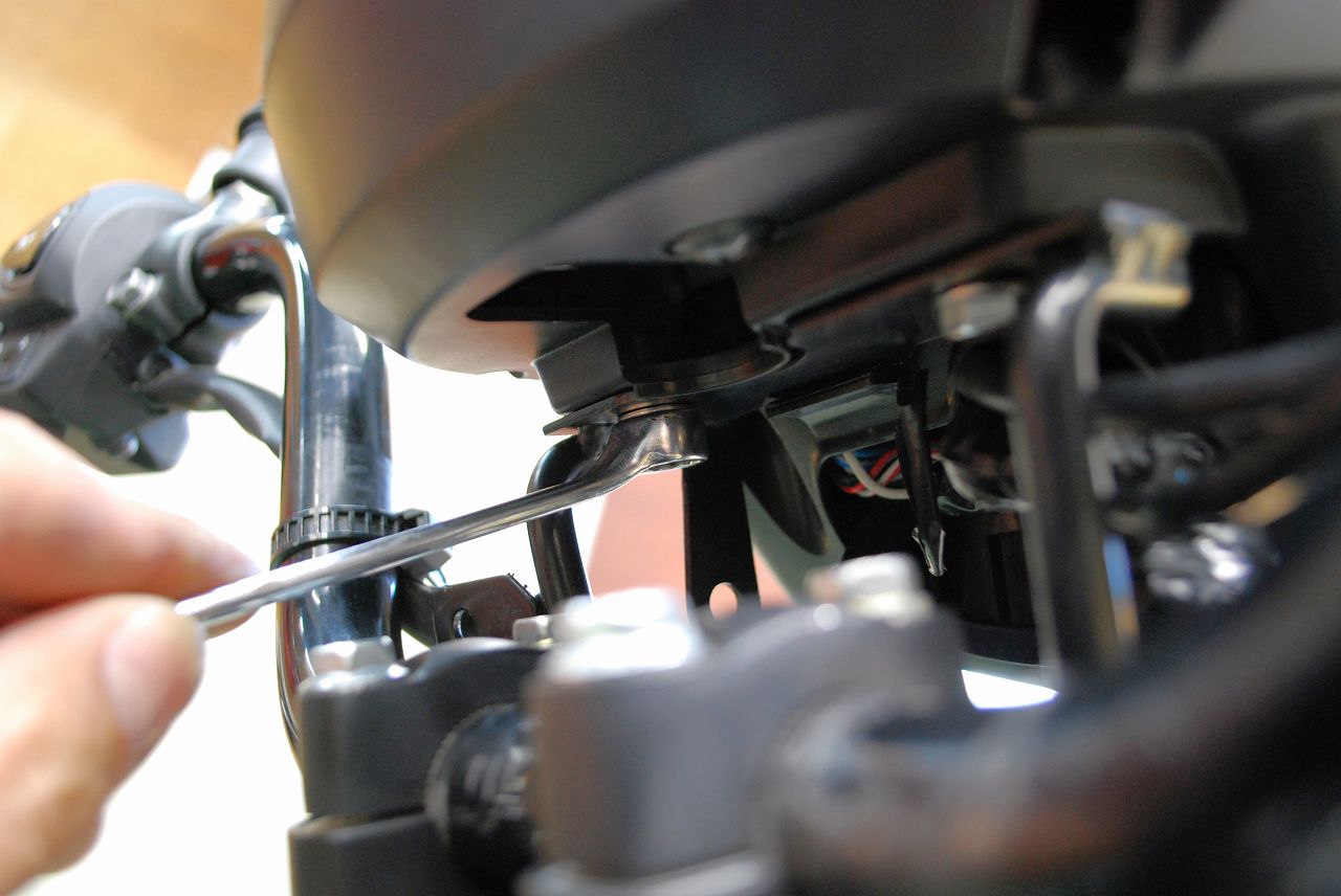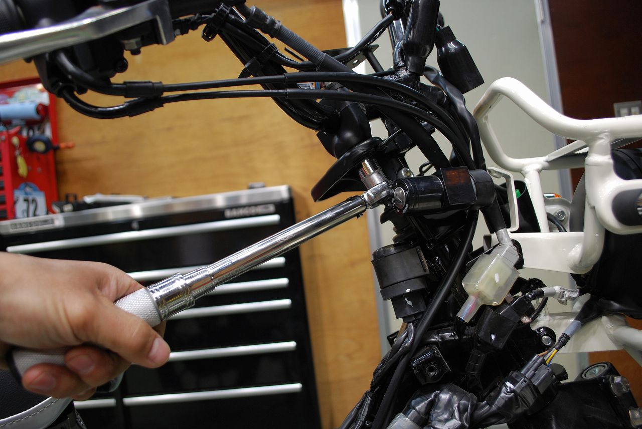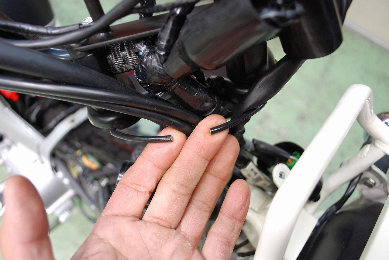 ハンドルを左右末切りし、ハーネスやブレーキホース、スロットルケーブルが車体に引っ掛からないか突っ張り過ぎていないか確認します。