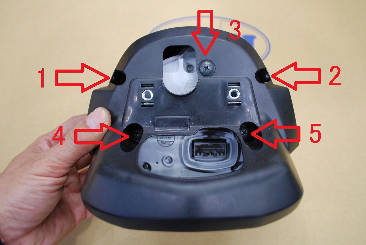 「3」「4」「5」のビスを外し、メーターカバーとメーター本体を分離させコネクターを外します。