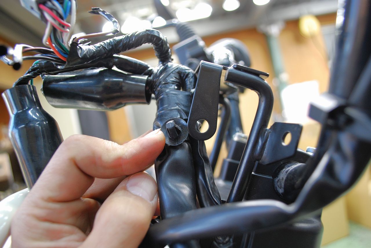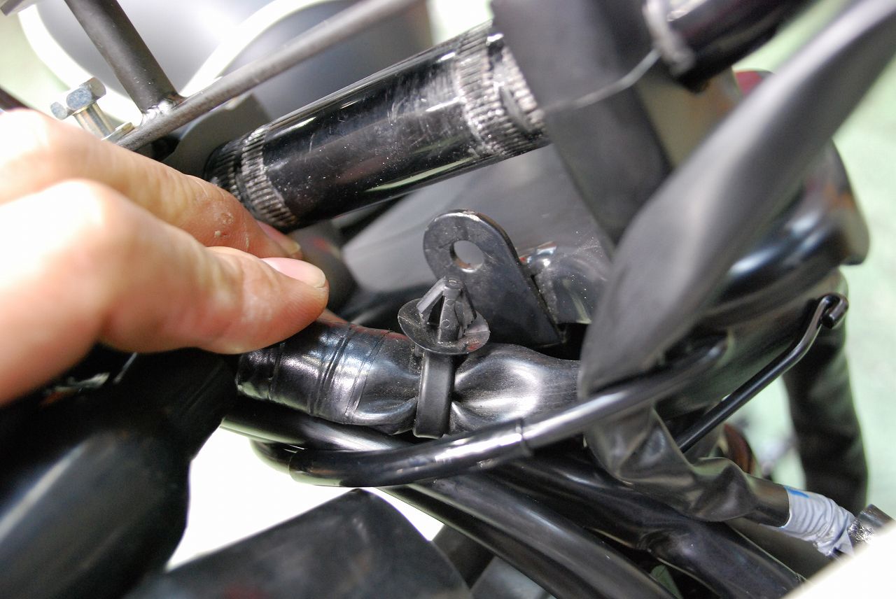 ハンドルポストのケーブルホルダー切り欠きからホルダー内側へ、ハーネスやスロットルケーブル、ブレーキホースを移動させ、純正オリジナルの取り回しに近くなるよう整理します。