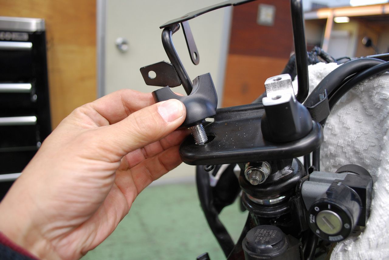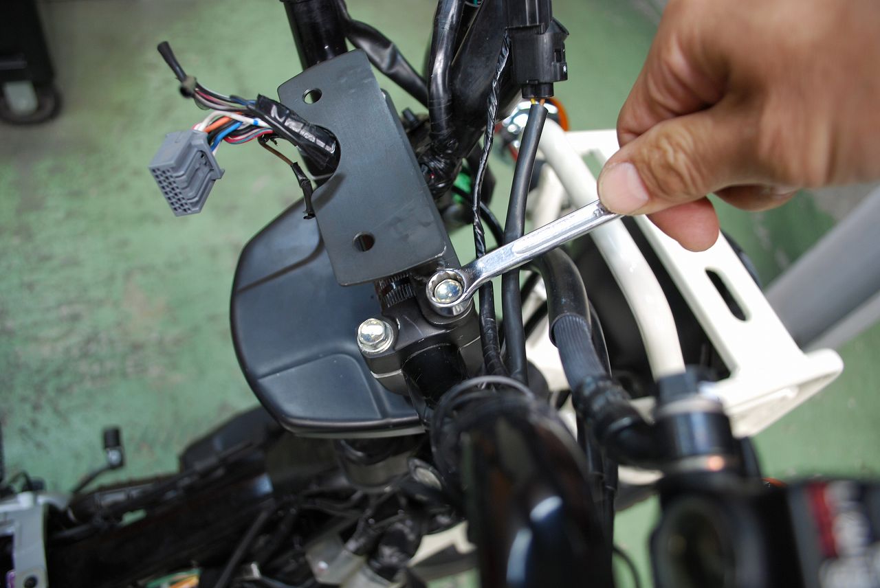 メーターにコネクター(配線)を差し込みロックさせ、ハーネスを取り回した後に、メーター本体とメーターステーを固定します。