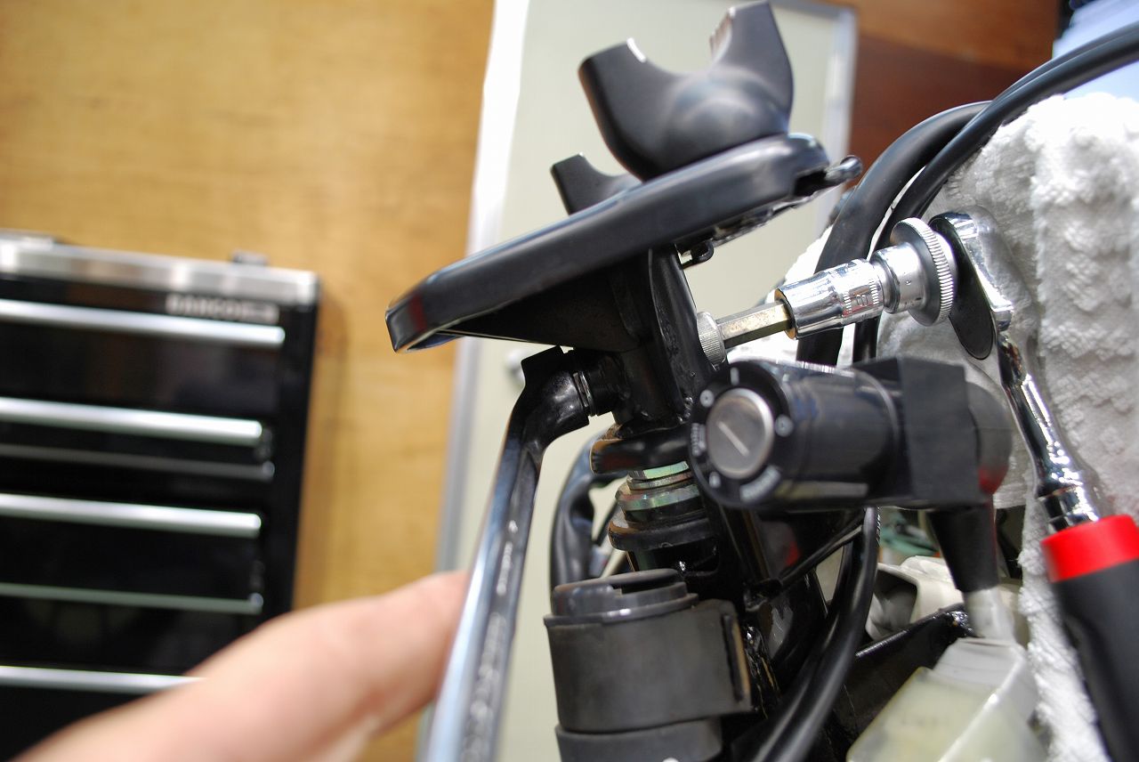 ハンドルポスト裏側にあるハンドルホルダーロアーの固定ナット2個を緩めます。