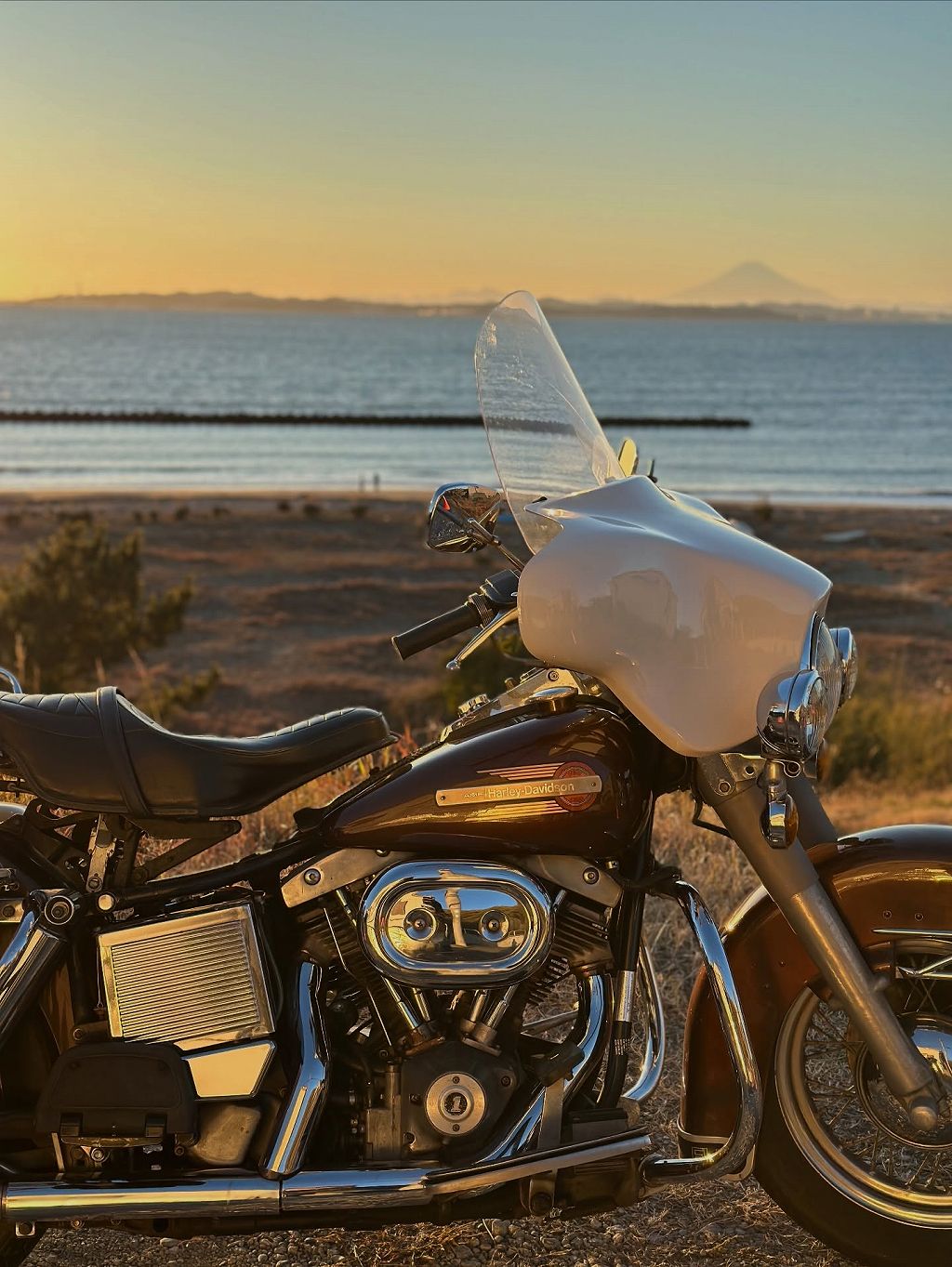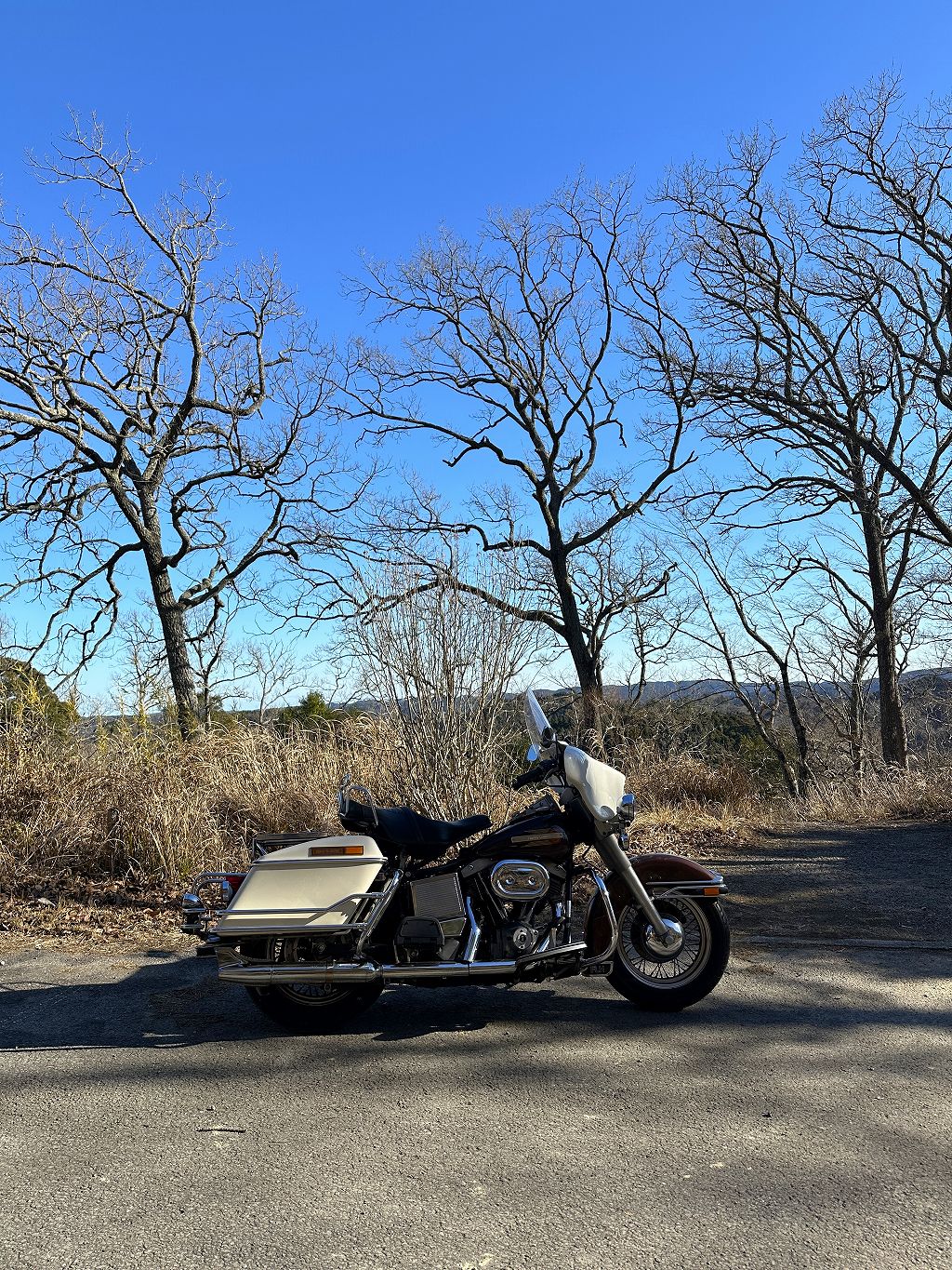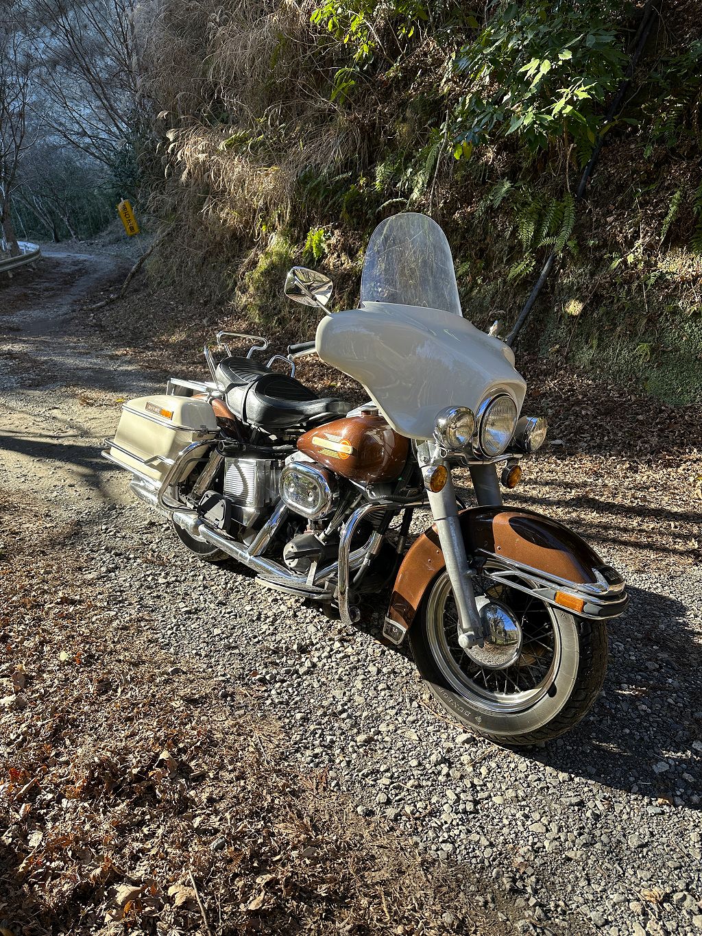今のHDは座るバイクだけど、この頃のは立つ(こともできる)バイクなんだよね。