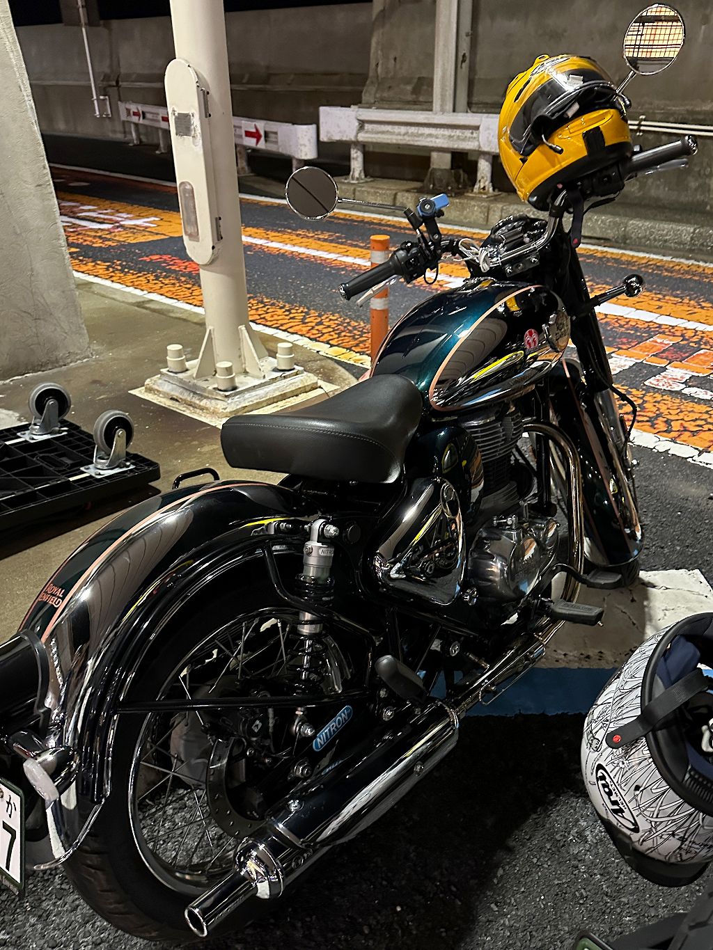 買い物済ませ戻ってきたら向うに黄色いヘルメット掛かったロイヤルが停まってる!?