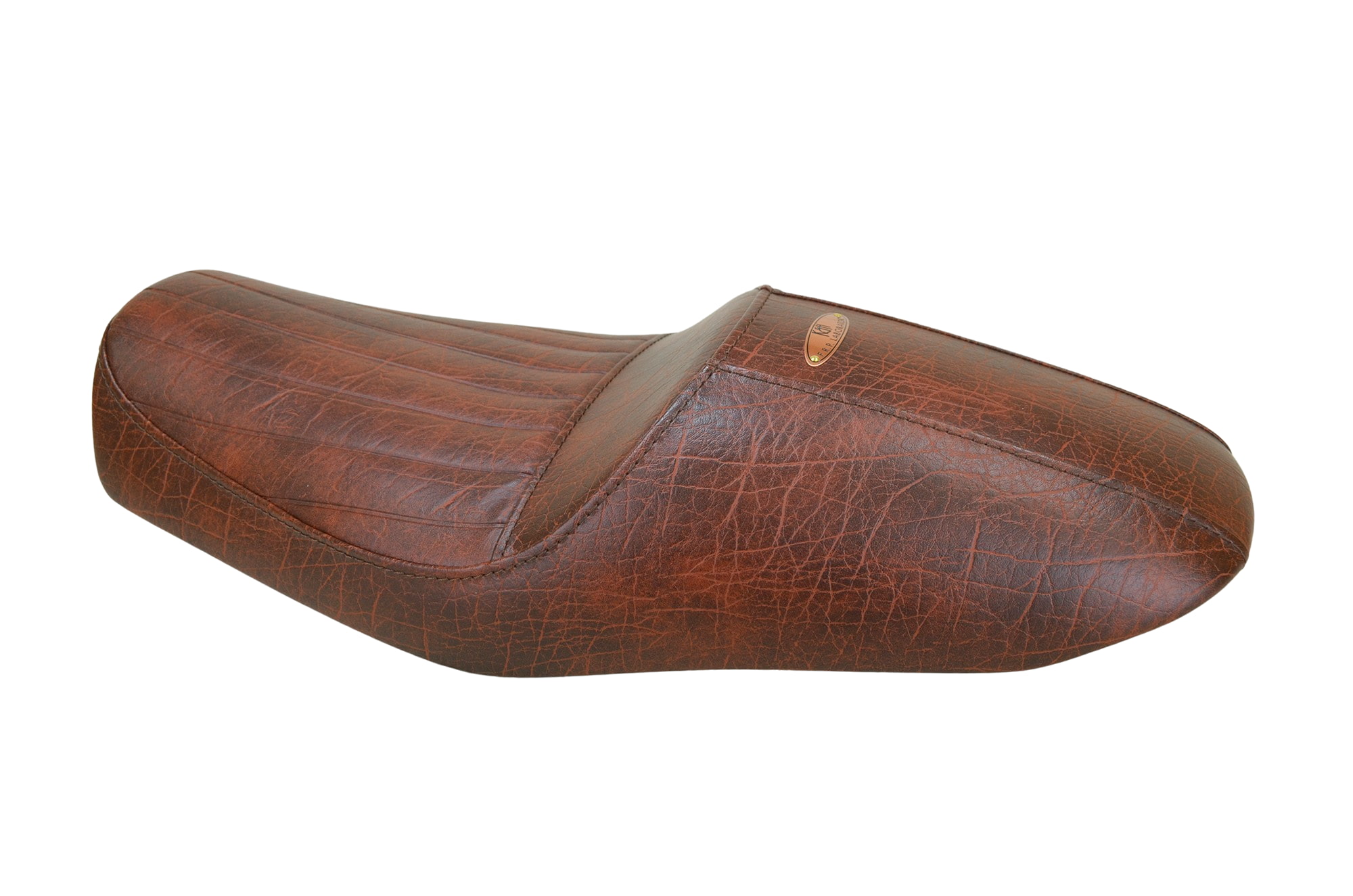 全体をアンティークレッドブラウンレザーでオーダー。座面は縦タックロールで仕上げています。また、ネームプレートは銅を設置しました。ステッチは特に色のご指定が無い場合、変更したレザーに準じた色味がかかります。
