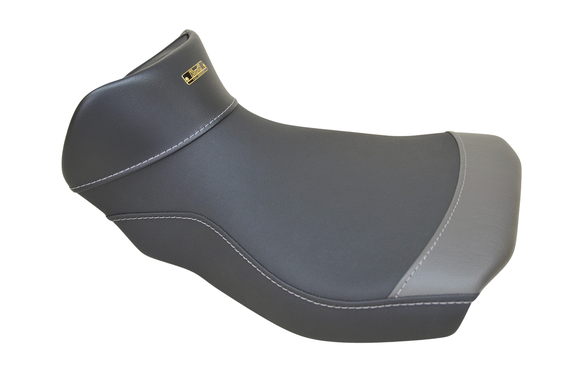 座面はすべり止めブラック、座面切替はダークグレー、それ以外を標準黒レザーで仕上げました。ステッチはメディアムシルバーに変更しています。また、ネームプレートは【黒/黒】を取り付けました。