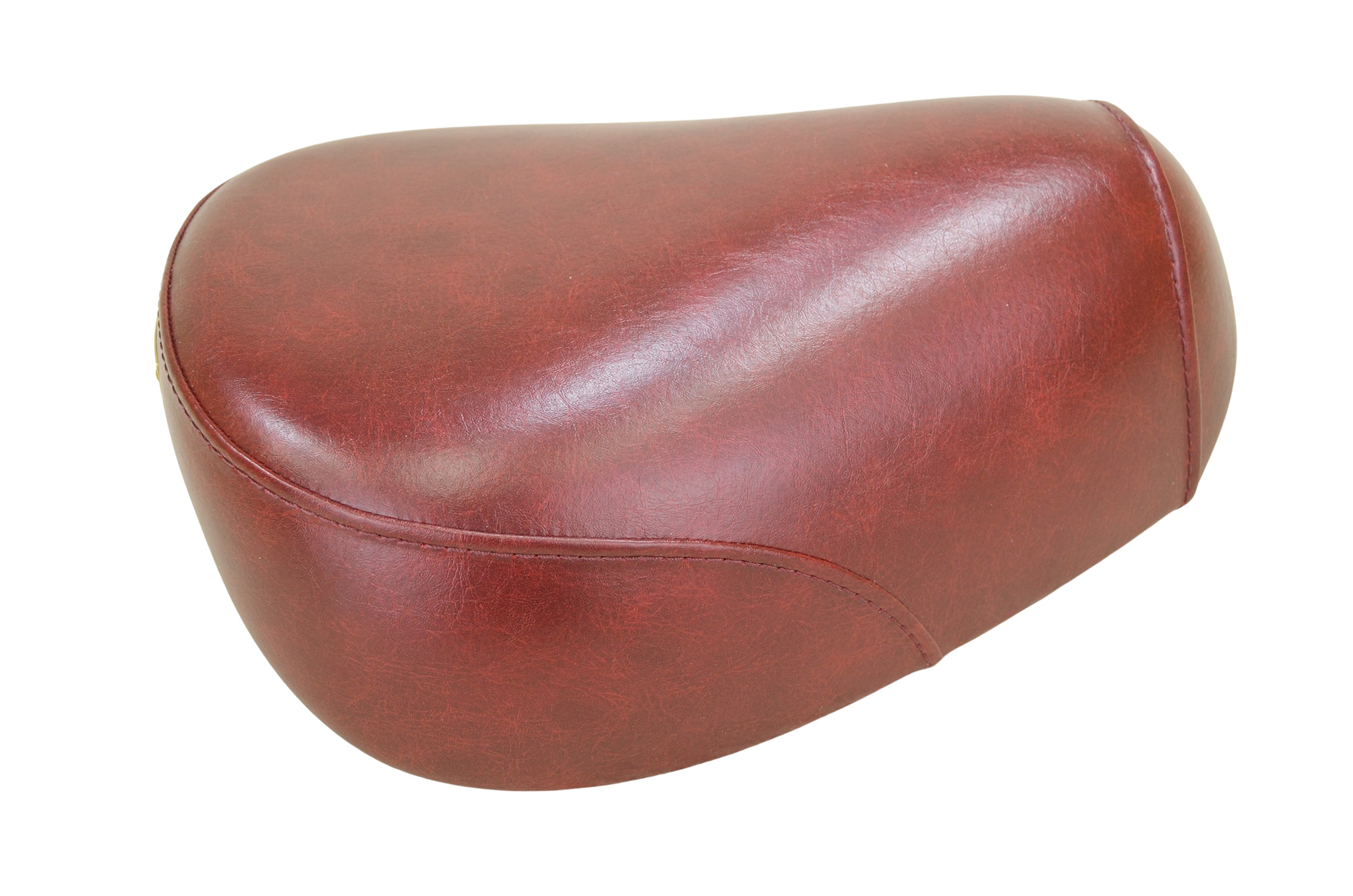 レザー全体をダークチェリーに変更しました。ステッチカラーは特に指定がない場合、レザーに準じた色に変更させて頂きます。 通常弊社の布製ピスネームがシート右側に付きますが、このシートでは金物のネームをシート後部中央に取り付けています。ネーム無しでのご納品はできません、ご了承下さい。