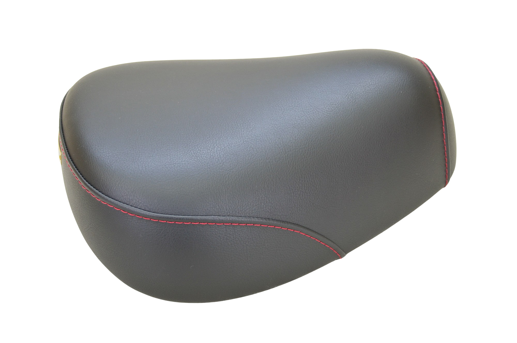 ステッチカラーをレッドに変更。レザーは標準黒を使用しています。 通常弊社の布製ピスネームがシート右側に付きますが、このシートでは金物のネームをシート後部中央に取り付けています。ネーム無しでのご納品はできません、ご了承下さい。