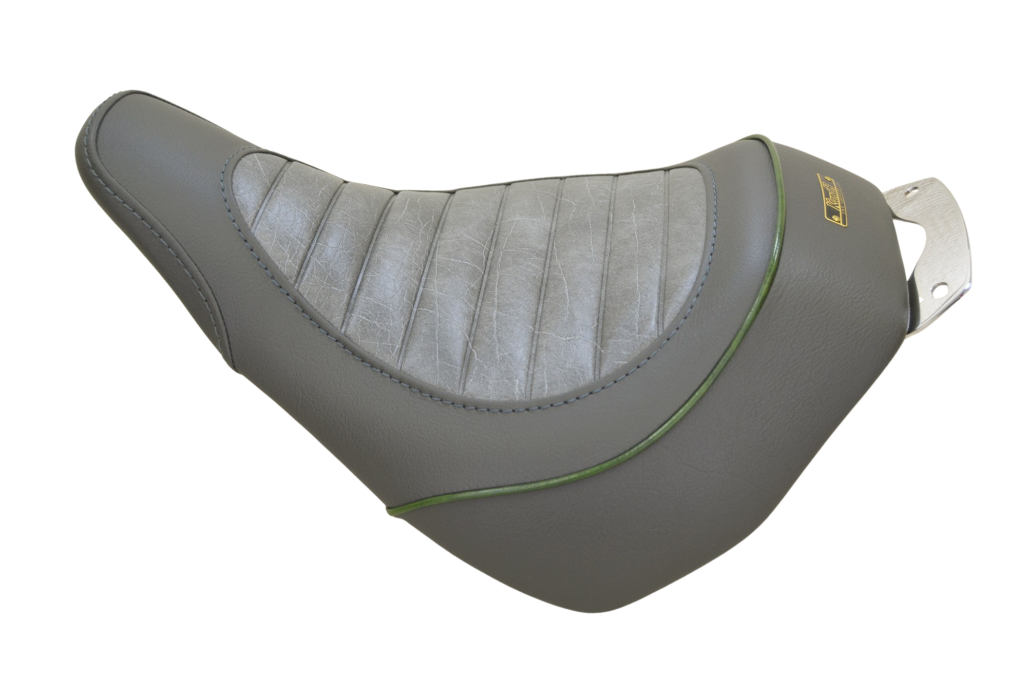 タックロールをアンティークグレーに、それ以外をダークグレーレザーに変更。パイピングカラーはアイビーグリーンを使用しています。ネームプレートは【黒/黒】を取り付けました。