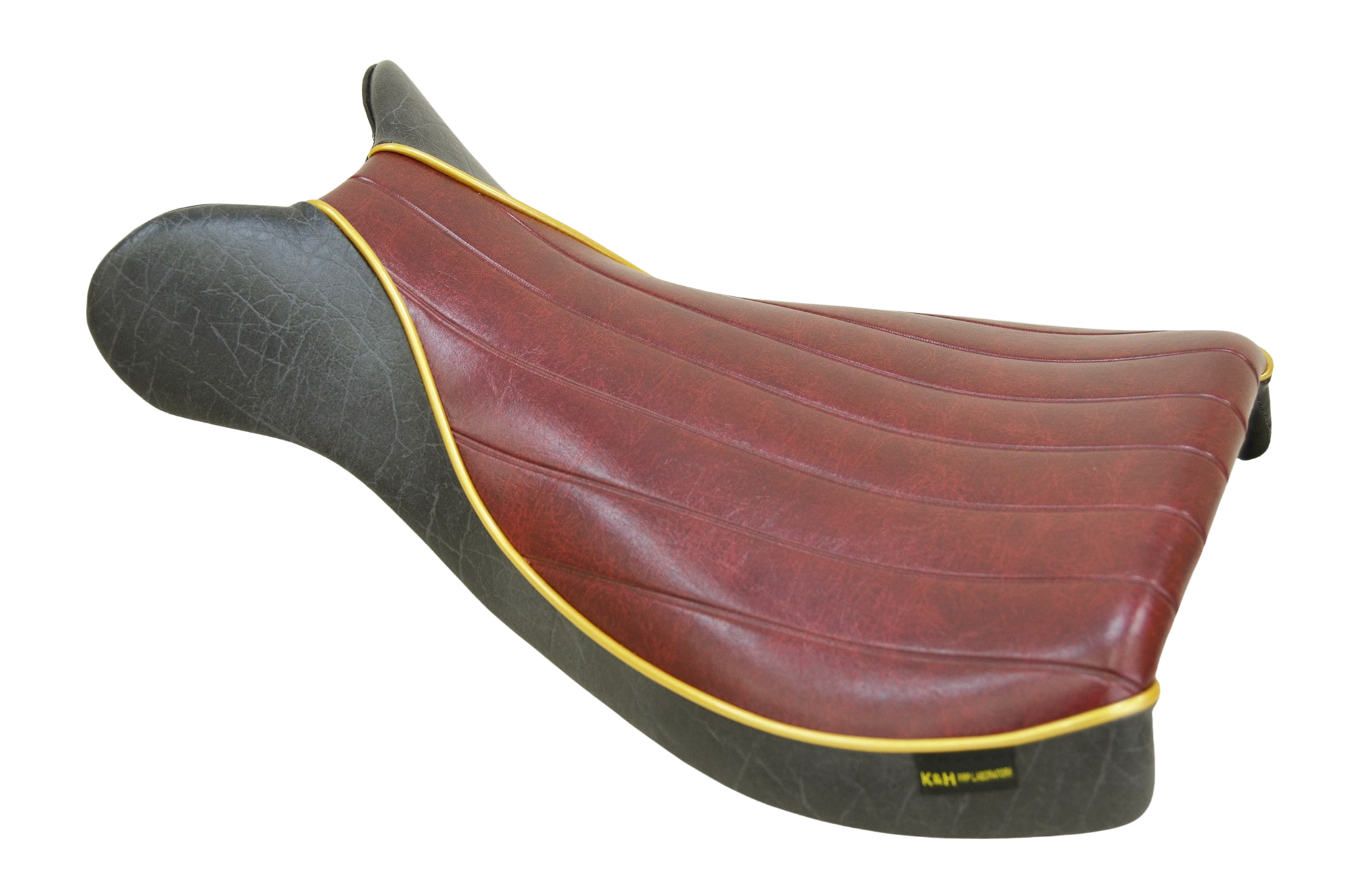 座面をダークチェリーに、それ以外をアンティークブラックレザーに変更。パイピングカラーはゴールドを使用しました。通常このシートの座面はラインが左右に走る横タックロール仕様ですが、この例ではラインが前後に走る縦タックロールでのオーダーです。
