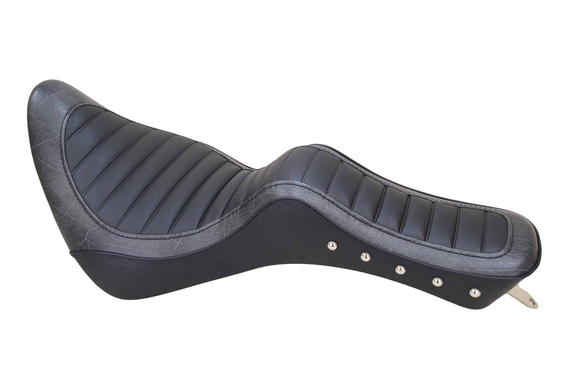 レザーはタックロール部分を標準プレーンブラック、その外側の座面をアンティークブラック、サイドはオーストリッチブラックに変更しました。また、丸スタッドをサイド後方に左右5個づつ、計10個取り付けています。