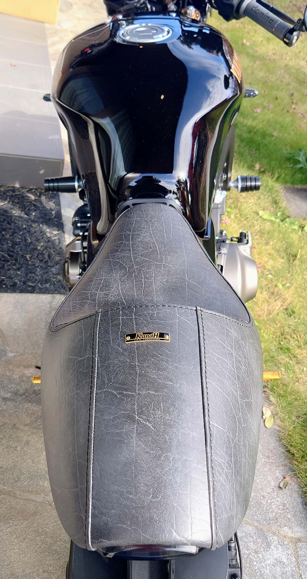 『以前オーダーしたハンターカブのシートとお揃いの革でお願いしました。